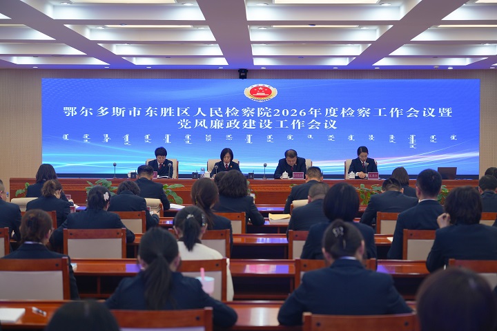会议指出,2026年是党绝对领导下的人民检察制度创立95周年,是全区、全市检察工作实现“三年一大变”后的新起点,也是推动东胜检察“创造一流业绩、打造一流品牌、锻造一流队伍”长远目标开花结果、取得实效的关键之年。要坚持以习近平新时代中国特色社会主义思想为指导,深入贯彻习近平法治思想,全面落实党的二十大和二十届历次全会精神,坚定拥护“两个确立”、坚决做到“两个维护”,坚持党对检察工作的绝对领导,坚持大局为重、民生为大,坚持法律监督主责主业、高质效办案本职本源,深入整改区委巡察反馈问题和市院“一院一评”反馈意见,树立和践行正确政绩观,持续践行“高质效办好每一个案件”、努力让人民群众在每一个司法案件中感受到公平正义的检察履职办案基本价值追求,紧紧围绕自治区党委“1571”工作部署、自治区党委政法委“1147”工作思路、市委建设“六个暖城”发展目标和区委“品质之城、生态之城、平安之城、幸福之城”建设,依法全面充分履行检察职能,以更高质效的法律监督为“十五五”良好开局提供强有力的司法保障。